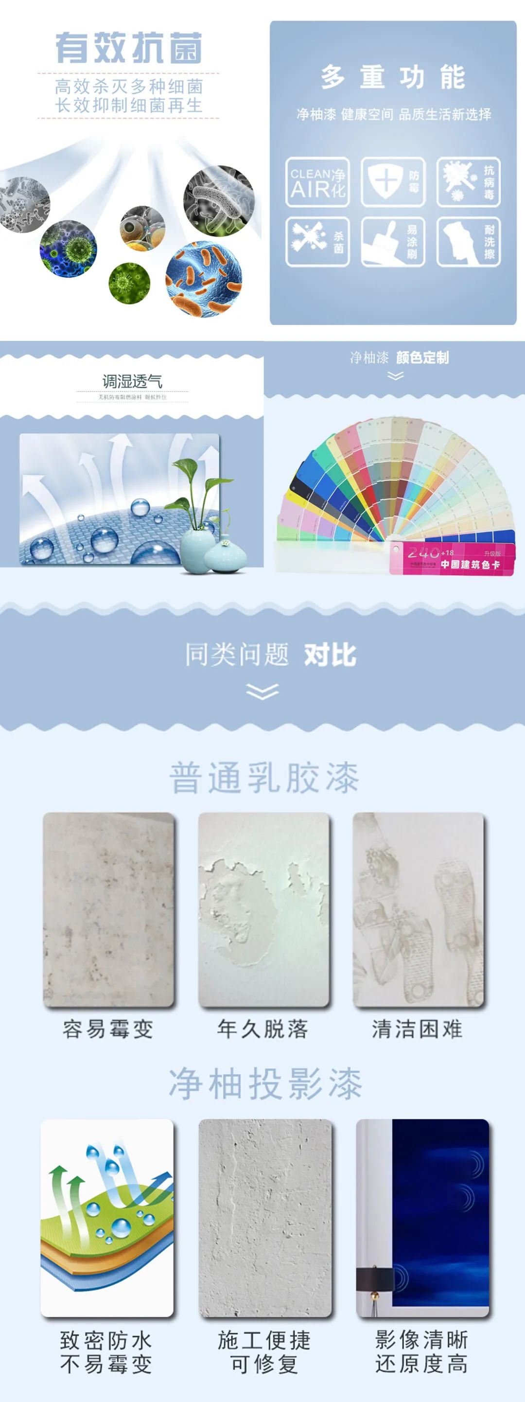該產(chǎn)品在普通乳膠漆表面進(jìn)行罩面,賦予其抗污自潔、防滲水、耐化學(xué)、耐老化、抗劃傷等優(yōu)異性